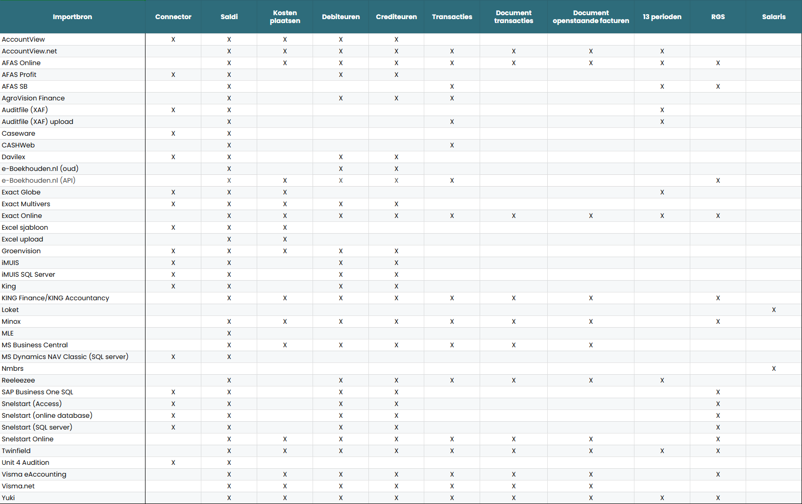 Je kunt je boekhoudpakket of salarispakket koppelen aan een administratie in Visionplanner. Daarbij is je boekhoudpakket of salarispakket de importbron. In de tabel zie je welke onderdelen je kunt gebruiken met jouw importbron.